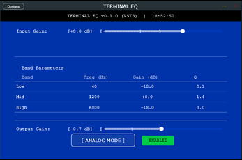 Terminal EQ is a 3 band EQ with a terminal inspired UI featuring analog mode.